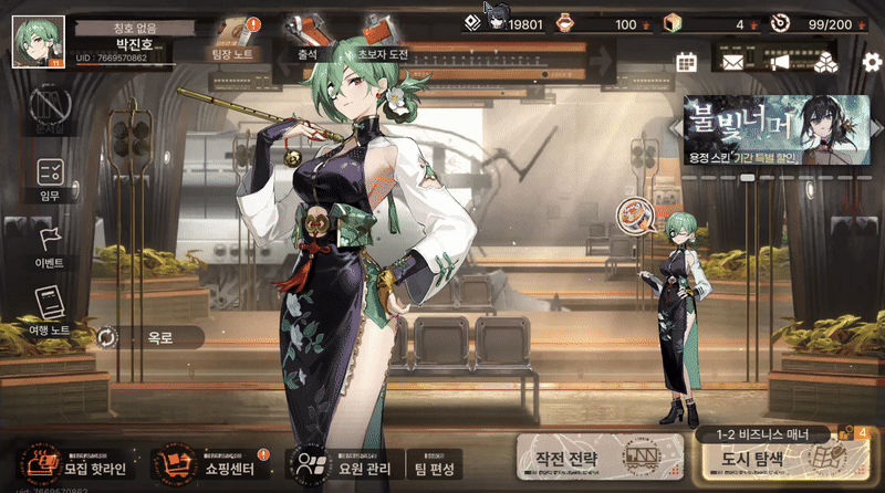 로비에 들어서자마자 눈에 들어온 건 하이 퀄리티 일러스트와 부드러운 애니메이션이었습니다. 저는 로비 캐릭터로 섹시한 치파오를 입어 과감하게 허벅지와 겨드랑이를 드러낸 "옥로"를 선택하였습니다. 단순히 외모뿐 아니라 디테일한 캐릭터 움직임과 감정 표현이 살아있어 그저 서 있는 모습만 봐도 만족스러운 완성도였습니다. 초반에 선택할 수 있는 캐릭터만 봐도 다양한 매력이 느껴졌기에 앞으로 나올 신규 캐릭터나 코스튬도 매우 기대되는 부분입니다.